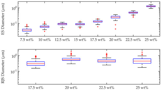 At the lowest viscosities, both spinning methods did not produce fibres, but instead produced droplets of solution containing PA6 as seen in Figure 6. Upon deposition on the collector surface, the low polymer concentration solutions produced a coating following the evaporation of formic acid. Electrospinning produced continuous fibres from 7.5 wt. % to 25 wt. %, whereas rotary jet spinning only produced fibres from 17.5 wt. % to 25 wt. %, after which no fibres were produced from either method due to nozzle blockage.
