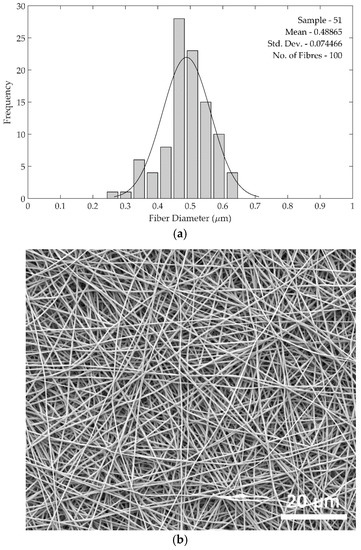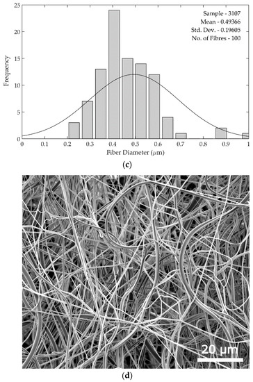 Fibre diameters were measured in batches of 100 sample measurements using ImageJ software (ImageJ version 1.48) (National Institute of Health, Bethesda, MD, USA), and compared as shown in Figure 4. The standard deviations of the fibre diameters are larger in the rotary jet spun samples compared to the electrospun samples, as can be seen from the histograms in Figure 5. The increased standard deviation from the rotary jet spun fibres is common in this process due to the uncontrolled and chaotic deposition of the fibres.