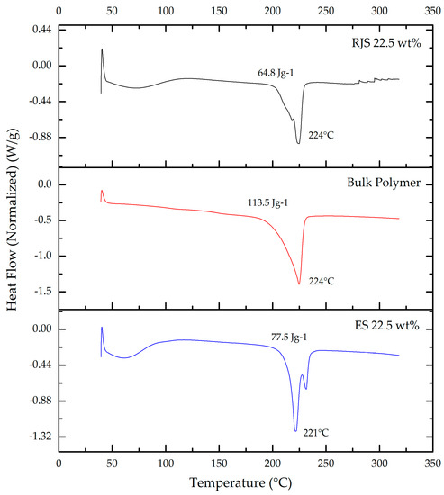 Differential scanning calorimetry (DSC) heating traces of PA6 fibres from rotary jet spinning (RJS), electrospinning (ES) and the bulk polymer, showing identical melting peak temperatures for PA6 bulk and rotary jet spun fibres. The bulk polymer typically contains slower forming α-form crystal structures whereas faster forming γ-form crystals are present in the as-spun fibres due to the rapid evaporation of solvent from the spinning process.
