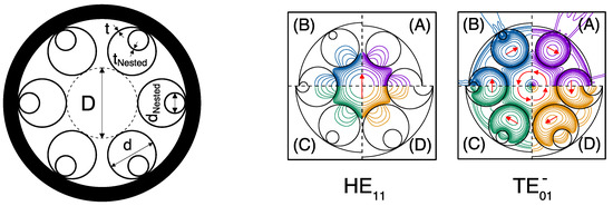 In order to analyze the influence of nested elements on the modal properties of ARFs, we propose in this work to maintain the six node-less capillary lattice structure described in [17] and add nested capillaries of inner diameter with the same wall thickness as the outer ones and attached to the cladding at the same azimuthal position, as shown in the left panel of Figure 1. Considering the fact that both the transmission band positions [11,12,16,17] and the leakage losses [13] are dependent on the wall thickness of the capillaries, the choice of setting allows for avoiding additional effects on the present study.
