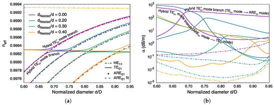 where the exponents and indicate the capillary linked to the core and the cladding, respectively; the refractive index of inner medium made of air ( = = 1) ; the coefficient is the m-th zero of the Bessel function , with for vector modes and for linearly polarized modes. The effective diameter or is the inner diameter of the capillary. The coefficients and are used to adjust the value of diameters d and D in order to match the analytical values from Equation (2) to the numerical results of finite-element simulations. In Figure 2a, are plotted the fitted values for each air-capillary mode (red dashed curves) calculated using Equation (2) with the fitting coefficients reported in Table 1. Analytical and numerical computed values are in excellent agreement. The dependence of the coefficient with respect to the dimensionless parameter can be related to the space filling rate of the nested capillaries inside the outer ones. Indeed we observe in Figure 2a that the more the nested capillary diameter increases, the more the effective index of the air-capillary mode decreases with both parameters D and d held constant. According to (2), the combination of two nested capillaries can then be defined by a single capillary with an effective diameter of smaller size. For the HE core mode, the effective index value showing a very low variation at constant core diameter ( m), the application of Equation (2) allows by taking the average of the effective indices for each value of to find a constant value of the fitting coefficient equal to 1.07. We verified that this increase in core diameter by can be applied to the first four higher-order core modes and found that the effective indices of the HE, TM and TE core modes in NANFs match the effective indices of the modes in the corresponding capillary with a precision of order to . At the avoided crossing point of the coupled modes, the equivalence of effective indices between the TE core mode and ARE air-capillary mode by using Equation (2) allows to derive a simple expression for the parameter: