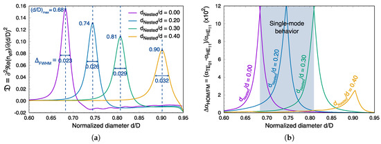 To quantify the avoided crossing properties, we introduce the quantity . By analogy with chromatic dispersion, we can associate this quantity with the effective index dispersion of a mode in relation to . In Figure 3a, we plotted the obtained curves for the four values of the parameter . For each transition region, we observe that the effective index dispersion curve exhibits a concave profile and large positive coefficient around a specific value corresponding at the phase-matching to resonance point . These values are summarized in Table 1. The numerical result presented for is in good agreement with that of the [17], and thus ensures the validity of the optimal values for the ratio for which an avoided crossing between the TE core mode and the air-capillary mode exists. Similarly to what was already described in [24], the strength of the interaction between the core mode and the air-capillary mode or, in other words, the degree of overlap between the fields of the two modes is proportional to the magnitude of the range over which the transformation takes place, and is conversely in proportion to the peak value that is smoothed. As a result, we can deduce that an increase of the nested capillary’s diameter induces a stronger coupling between these modes because the full width at half maximum of the curves increases slightly with the parameter and the peak value at decreases. This increased interaction is related to the nested capillaries which increasingly squeeze the air-capillary modes towards the fiber core when their sizes increase (see Figure 1 at the right).