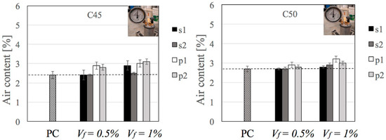 Air content measurement of plain concrete (PC) and fiber reinforced concretes for Vf = 0.5% and Vf = 1%.