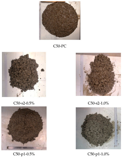 Regarding concrete consistency, Figure 3 shows slump reduction as a function of fiber type and content (slump classes S1, S2, S3 and S4 according to EN 206-1 [54] are also underlined in Figure 3). It is worth mentioning that all the slump values obtained were within the acceptable range of the test (see Section 2.2).