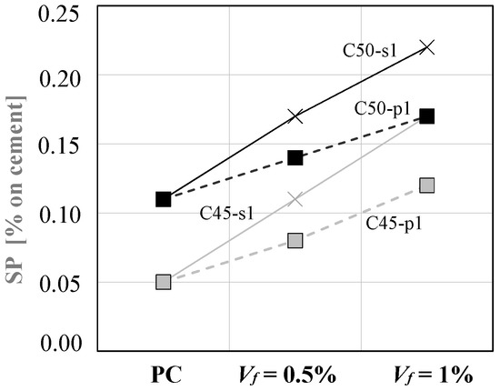 Superplasticizer (SP) dosage necessary for FRC (Vf = 0.5% and Vf = 1%) to obtain the same slump as PC (180 ± 20 mm).