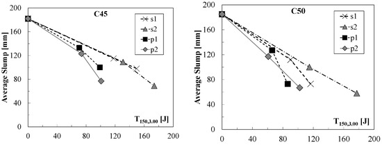 Figure 8 shows the slump values as a function of the flexural toughness (T150,3.00) for both steel and macro-synthetic fibers (flexural toughness was used since it represents the overall post-cracking behavior of FRC). This allows evaluation of the effects of the fibers themselves, i.e., independent of fiber content, on concrete workability considering the different FRCs as composite materials (matrix + fibers). As expected, the relation between slump and toughness is dependent on fiber type and length. However, it can be observed that, for a given flexural toughness, macro-synthetic fibers affect concrete workability more as compared to steel ones. This is opposite to the results underlined in Section 3, which can be tied to the high content of macro-synthetic fibers needed to reach post-cracking mechanical performances similar to the ones provided by steel fibers. In addition, it seems that, in the ranges considered, steel fibers have a linear slump reduction with toughness increase, while this trend changes in the case of macro-synthetic fibers (with a more pronounced reduction for value of T150,3.00 greater than 70 J).