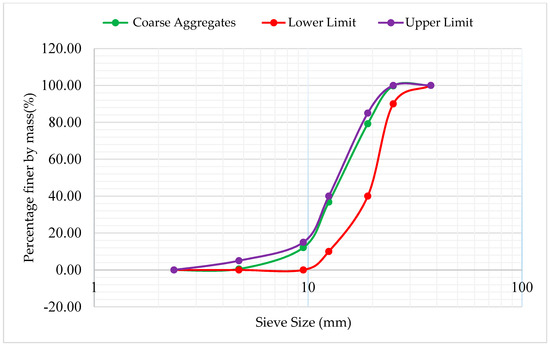 Crushed granite of a nominal size of 9.5–25 mm supplied from Ruiru, Kenya was used. The grading limits for coarse aggregate were found to be within the limits of ASTM C33 [16], as shown in Figure 2. Its properties are presented in Table 5.