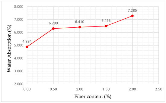 The water absorption of concrete by immersion is an important property that gives an indirect indication of the pore structure of the concrete and durability performance in a corrosive environment [32]. The water absorption of SFRC in the present study is depicted in Figure 4. The result indicates that reinforcing concrete with sisal fibers causes a significant increase in the water absorption of concrete. As recorded, there was a sudden rise of 28.99% in the absorption of concrete by adding 0.5% sisal fiber at 28 days. Subsequent incremental of 0.5% sisal fiber resulted in little rise until 2% sisal was incorporated in the mix, resulting in a 49.176% increase in water absorption compared to the control concrete. In summary, the water absorption of concrete cubes was observed to increase with a rising percentage of sisal fiber addition in the mix. A similar result was reported by [1,33,34], although Afroughsabet and Ozbakkaloglu [35] reported that including additives like silica fume in concrete can help in reducing the water absorption of FRC.
