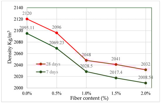 The result shows that SF0 has the highest density (2120 kg/m3), while SF4 has the lowest density (2032 kg/m3), which is outside the range of structural light weight concrete, hence can be classified as normal weight concrete. The density of concrete was reduced at percentages of 1.14%, 3.41%, 3.74%, and 4.18% for SF1, SF2, SF3, and SF4 as compared with SF0 at 7 days of curing. At 28 days of curing, the percentage reductions in the density were 1.24%, 3.18%, 3.71%, and 4.13% at 0.5% 1.0%, 1.5%, and 2.0% sisal fiber addition, respectively. The inverse relationship between the density and percentage of sisal fibers is a result of the lower bulk density of the sisal, which is taking the place of denser constituents, like coarse and fine aggregates [1,27].