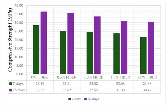 The results of the compressive strength test of SFRC at both 7 and 28 days for concrete cubes are presented in Figure 6. For each curing age and increasing sisal fiber content in the concrete mix, the result shows decreasing compressive strength value below that of the control. The reduction can be attributed to the reduction in adhesive properties between the surface of the fiber and cement paste, resulting in the need for higher compacting energy and the required compressive strength [37]. Furthermore, sisal is classified as a hydrophobic material, implying there is the tendency of it leaving behind freer water–cement, impeding strength gain.