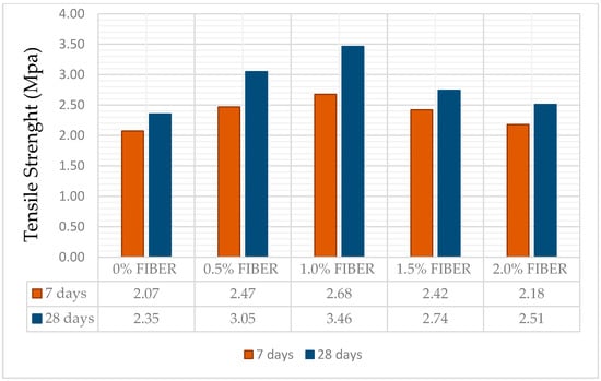 This is an indirect tension test method on a concrete cylinder to obtain its tensile strength. The results of the split tensile strength are illustrated in Figure 7. The data show that sisal fibers can enhance the splitting tensile strength of concrete, but up to a limit. The split tensile strength of SFRC at each curing age increases up to 1% before declining. The 28-day split tensile strength value was higher than that at 7 days of curing. However, the least tensile strength of SFRC at 7 and 28 days was still higher than that of the control, implying that incorporation of sisal increases the tensile strength of concrete for all percentages of addition.