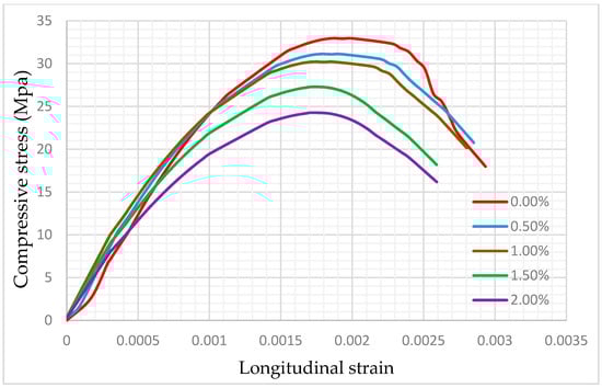 Furthermore, the addition of sisal fibers resulted in lower strains at ultimate compressive stress in comparison with the control. The longitudinal strain at maximum compressive stress was generally lower than 0.0019 for SFRC, with the maximum strain being observed in the control (0.00187). Figure 8 shows that SFRC had better post-yield behavior, unlike the control that exhibited quasi-brittle failure.