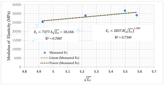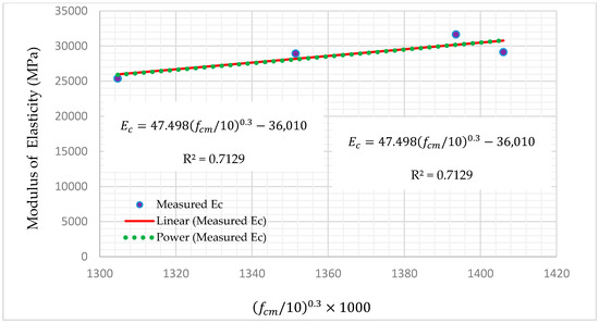 For comparing the constants given by Eurocode-2 [49] and IS 465-1989 [48], a simple regression analysis was done on the measured Ec using the equation forms recommended by the codes as shown in Figure 10 and Figure 11. The constants obtained from the regression analysis are (7377.4 and 47.498) respectively which deviates from those given by the codes (5688 and 22). Considering the coefficient of determination obtained, the function, which best represents the measure Ec, is that from Eurocode-2 [49]. A power trend line was fitted for both predicted values to improve the coefficient of determination. The power equations gave a higher coefficient of determination of 0.7349 for both codes.