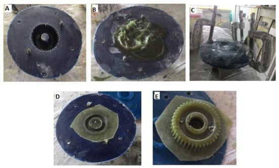 (A) Mold for gear. (B) Moldfilled with resin and fiber. (C) Mold compressed with c-clamp. (D) Product in the mold. (E) Final product.