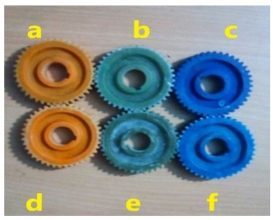 (a) Flax fiber-reinforced polyester gear (FFRPG)-20. (b) Sisal FRPG (SFRPG)-20. (c) Glass FRPG (GFRPG)-20. (d) FFRPG-15. (e) SFRPG-15. (f) GFRPG-15.