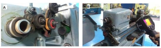 Senthilvelan et al. [15] say that the heat generated in gears is a result of heat and the hysteresis effect, friction, as well as the hysteresis loss increases with increase in gear rotational speed; therefore, the speed is maintained constant for all the gears to achieve single conclusion for low speed. The initial weights of the gears as well as the temperatures of the gears were measured with the contactless infra-red temperature camera (FLIR E6, FLIR Systems Inc., Wilsonville, OR, USA) before running. After one hour, the temperatures and the weight reduction due to wear are once again measured and tabulated. The meshed gear in the lathe and the FLIR measurement are shown in Figure 3A,B.