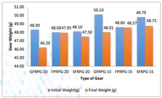 The weight reduction in the gears before and after running was measured using a 0.1 mg accurate weighing machine. Figure 6 shows the comparison of initial and final weight for all the gears. Glass fiber-reinforced gears show the highest percentage of reduction, whereas the reduction percentage in natural fiber-reinforced gears is less than 1%. The main aim of this work is not comparing metal and polymeric gear, which has been done by many researchers already, including a notable work by Mahebubet et al. [16]. The aim of this work is to replace or compare glass fiber reinforced polymeric gears with natural fiber reinforced gears, which has been shown clearly.