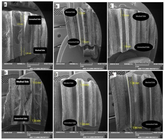 Reduction in tooth thickness. (A) GFRPG-20. (B) FFRPG-20. (C) SFRPG-20. (D) GFRPG-15. (E) FFRPG-15. (F) SFRPG-15.