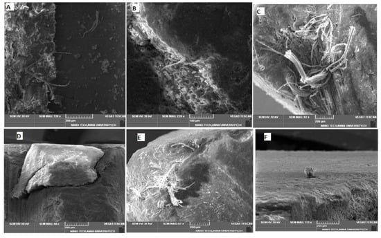 Fiber pull outs. (A) GFRPG-20. (B) FFRPG-20. (C) SFRPG-20. (D) Tooth break after 20 min of running in GFRPG-15. (E) FFRPG-15. (F) SFRPG-15.
