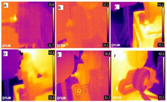 Thermal images. (A) Initial temperature of GFRPG-15. (B) Final temperature of GFRPG-15. (C) Initial temperature of FFRPG-15. (D) Final temperature of FFRPG-15. (E) Initial temperature of SFRPG-15. (F) Final temperature of SFRPG-15.