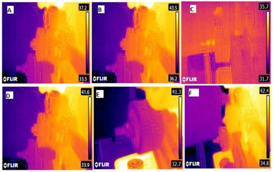 Thermal images. (A) Initial temperature of GFRPG-20. (B) Final temperature of GFRPG-20. (C) Initial temperature of FFRPG-20. (D) Final temperature of FFRPG-20. (E) Initial temperature of SFRPG-20. (F) Final temperature of SFRPG-20.