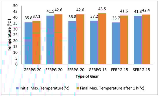 The surface temperature of the gear increases while running, even though the rotational speed is kept constant; the temperature of the surface may rise because of continuous running. This rise in temperature of the surface is measured using one of the latest devices, an FLIR camera (FLIR Systems, Inc. Wilsonville, OR, USA), which is a new innovation in inspection tools, with this contactless measuring system, the surface temperature before and after running the gear for 1 h can be easily noted, and the same can be tabulated, as in Table 2. The images recorded for various gears in the FLIR are shown in Figure 9 and Figure 10. As a result of high thermal conductivity and the brittle nature of the glass fiber, the temperature of the glass fiber-reinforced gears rises, when it reaches 37 °C in 15% fiber and 43 °C in 20% fiber, which is after 20 min of running, the gear tooth breaks. Whereas the natural fiber-reinforced gears, irrespective of the weight percentage of fiber, run successfully for 1 h in mesh with the metal gear at 150 rpm until 42 °C. A comparison of maximum initial and final temperature of the gears is shown in Figure 11.