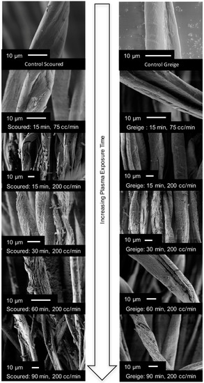 With SEM image analysis, we achieved a more comprehensive visualization of polymer degradation, or lack thereof. Scoured yarns were seen to have clear physical degradation, including pitting and splitting of the fibers, with as little as 15 min of plasma exposure (Figure 2 (left)). In contrast, greige yarns showed less severe damage at 15 min plasma exposure, but with increased plasma treatment time, pitting and breakages became apparent (Figure 2 (right)). The initial lack of significant degradation of greige yarn was attributed to the greater amount of waxes and other components present at the yarn surface compared to scoured yarns. The degradation we observed was much more severe than that observed previously by other researchers who implemented varying plasmas (i.e., air, O2) at shorter exposure times and/or lower power densities [7,18].