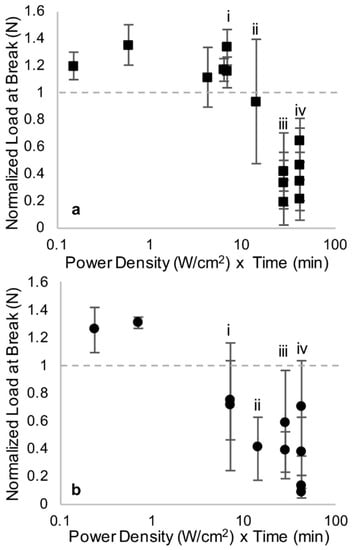 Load at break for yarns treated with O2 plasma normalized by breaking the load at break of control yarns: (a) greige yarn and (b) scoured yarn (plasma exposures using 0.46 W/cm2 at (i) 15 min, (ii) 30 min, (iii) 60 min, and (iv) 90 min. Bars = standard deviations).