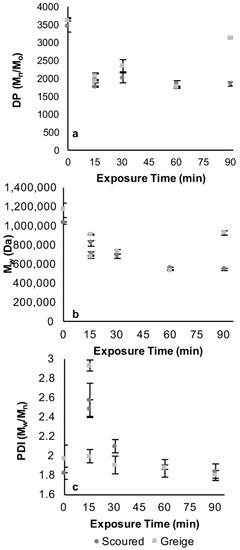 Considering the number of average molecular (Mn) values gathered by GPC, the degree of polymerization (DP) was calculated using Equation (1). The DP decreased by approximately half for both greige and scoured yarns (Figure 4a). We attribute the decrease in DP to main chain scissions [20]. In addition, the weight-average molecular weight (Mw) decreased significantly for plasma treated samples, compared to control greige and scoured yarns (Figure 4b).