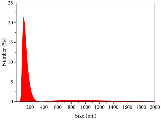 Figure 1 shows the size distribution of the cellulose particles produced from bengkoang peel fiber. 24.3% of the cellulose particles were below 100 nm in length which is within the nano-size range, but the other 72.5% were in the 100–250 nm micro-sized range. The reduction of cellulose size started from the removal of the amorphous components from the cellulose after acid hydrolysis [26,27], and then it was reduced further with ultrasonication as the high shear forces and cavitation energy broke up the particles. It also broke apart the aggregates of cellulose, enabling for better dispersion in the aqueous suspension. Similar results have also been reported by Abral et al. [18], who isolated nanocellulose from bacterial cellulose, and Niu et al. [28], who isolated nanocellulose from microcrystalline cellulose.