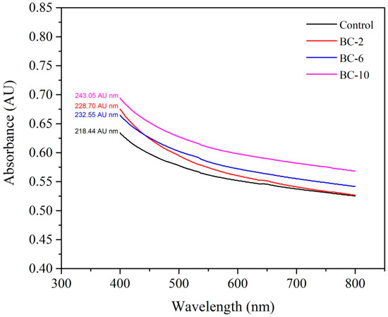Figure 2 shows the opacity of starch and biocomposite films. The addition of cellulose in the matrix increased the transparency of the biocomposites. For example, the opacity of the starch film was 218.44 AUnm, which was lower than that of BC-10 (243.05 AUnm, 11.27% higher). This is because cellulose is more opaque than starch film. Previous studies also reported on the increasing opacity of biocomposites with increasing fiber content [2,22].