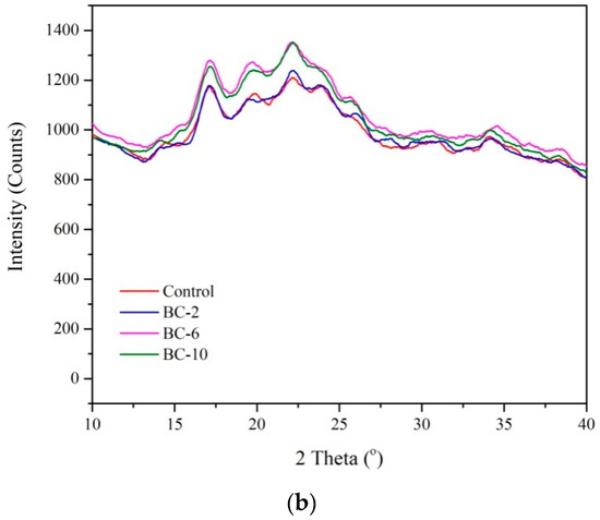 Figure 3 shows the XRD patterns of fibers, starch films, and biocomposite films. As shown in Figure 3b, two major peaks were observed at around 2θ = 17° and 22.2°. All films showed similar curves, but the diffraction intensity increased as the amount of cellulose increased from 1211 (Control) to 1351 (BC-10) at around 2θ = 22.2°. This result is because the presence of cellulose in the matrix CI for fiber was 58.48% higher than the starch and biocomposite films. In this case, crystallinity index (CI) for BC-10 was 2.51% higher than that for the control. A similar result was also reported by Abral et al. [13]; they reported the increasing CI of the composites with the addition of fibers.