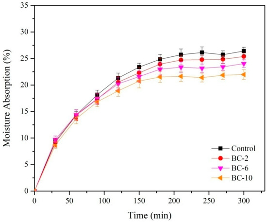 Moisture absorption for control and biocomposite films for 5 h testing time.
