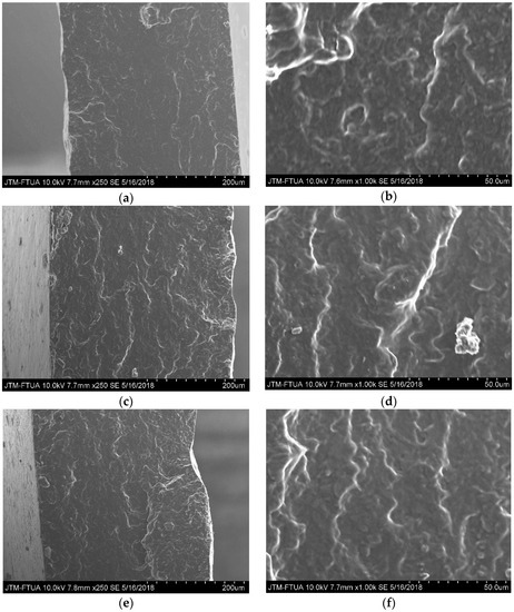 The morphology of starch and biocomposite film fracture surfaces were analyzed using a scanning electron microscope (HITACHI SU-3500, Hitachi High-Technologies Corporation, Tokyo, Japan) at an accelerating voltage of 5 kV in a 5 × 10−4 Pa vacuum. All samples were coated with gold (Au).