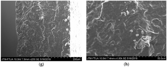 Figure 6a–h show the SEM micrographs of the cross-sections of starch and biocomposite films. As can be seen in Figure 6c,d, the biocomposite film fracture surfaces were slightly rougher compared to the starch films (Figure 6a,b). Increases in cellulose suspension loading resulted in an increased roughness of fracture surfaces (Figure 6e–h). There is no agglomeration of cellulose fibers observed on the surface. This indicates that fibers were well dispersed in the starch matrix, and it may indicate increases in interfacial hydrogen bonding and homogeneity of the biocomposite structure. This result is in a good agreement with the previous study [13]. The higher compactness between the matrix and fiber led to an increase in the crystallinity index as shown in Table 2. The better interfacial hydrogen bonding reduced the number of accessible -OH groups, thus increasing moisture resistance of the biocomposites. This result is supported by the moisture absorption data in Figure 5, which shows a decrease in moisture absorption with increased fiber loading.