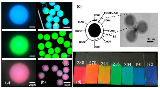 | poly (styrene-methyl methacrylate-acrylic acid) | 220, 246, 280 | 40 | polyvinyl alcohol | 14,500 | 13 | 4:1 | 0.5 | 10 | 15 | — | green, red, purplish-red color cylindrically hexagonal ordered | [69] |