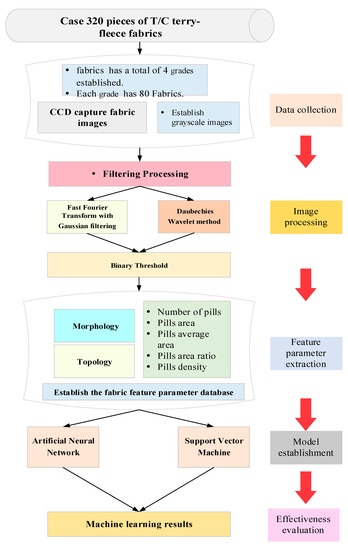 Saharkhiz et al. [6] applied the two-dimensional (2D) fast Fourier transform method for image processing, considering low-pass filtering and a suitable cutoff frequency. Three features were extracted: The number of pilling points, volume, and area. This study used clustering methods, including median-cut, k-means, and competitive learning, to classify textile pilling. Yun et al. [7] applied the fast Fourier transform and fast wavelet transform for image processing. The following three crucial features were identified: The number of pilling points, total pixel area of pilling, and the sum of the gray values of pilling images. Jing et al. [8] developed an objective fabric pilling evaluation method that incorporated the wavelet transform and local binary pattern. Their study normalized the values of extracted features and applied the support vector machine as a classifier to evaluate pilling grades; the results indicated a grading accuracy of 95%. Based on a standard of the Woolmark SM50 blanket set, Zhang et al. [9] proposed an objective pilling evaluation method for nonwoven fabrics. The developed method was a combination of pilling identification, characterization, and a neural network; the results indicated the proposed classifier to be feasible.