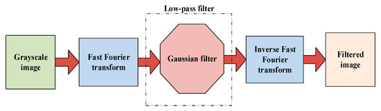 where u and v are the horizontal and vertical distances from the origin, respectively, and σ is the standard deviation of the Gaussian distribution. The DFT is designed for discrete and periodical signals. The DFT formula for discrete signals with and is presented in Equation (2). Using Equation (2), we can obtain an inverse conversion [F(x, y)] image with the signal and . The formula of the inverse DFT is provided in Equation (3).