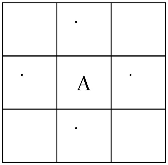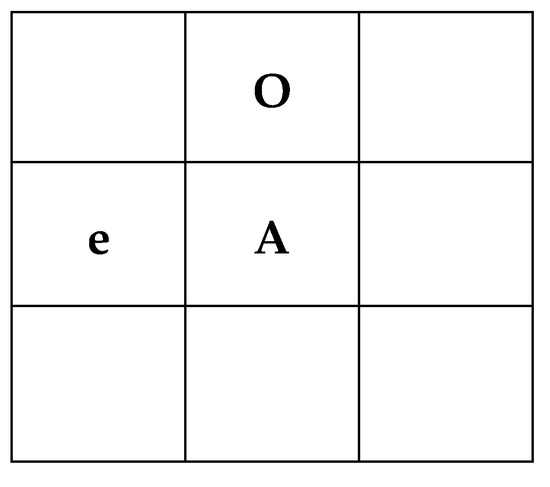 Image topology involves analyzing discrete objects in a 2D digital image and constructing a mathematical model to considerably simplify the algorithmic design. Assume that A is the current pixel. The top neighbor of A is o, and the left neighbor of A is e. A four-adjacency relationship defined for pixel A by adjacent positions is displayed in Figure 5 and Figure 6.