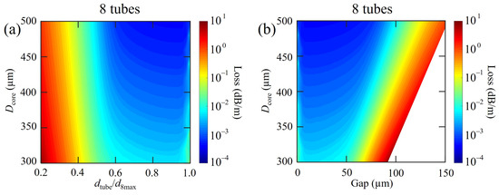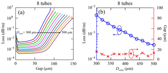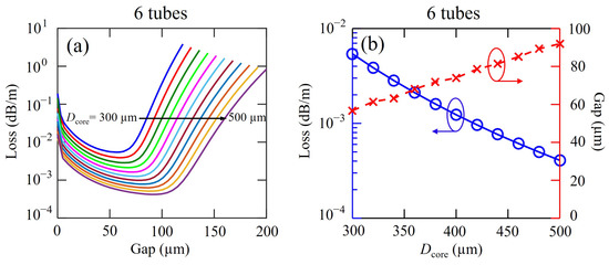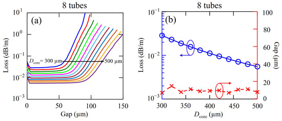- Alagashev, G.K.; Pryamikov, A.D.; Kosolapov, A.F.; Kolyadin, A.N.; Lukovkin, A.Y.; Biriukov, A.S. Impact of geometrical parameters on the optical properties of negative curvature hollow core fibers. Laser Phys. 2015, 25, 055101. [Google Scholar] [CrossRef]
