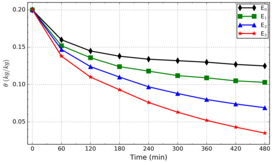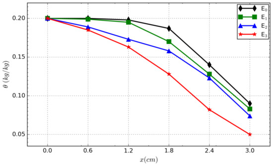 Figure 4 and Figure 5 showed the spatial distributions of temperature and moisture content throughout the wall for a period of time that is equal to 60 min () for the composites materials E0, E1, E2, and E3. It can be noticed that the temperature in the wall increases in the space through the addition of thatched fibers (Figure 4). This is due to the ambient temperature, which is higher than the wall’s temperature. It can be noticed that in Figure 5, the moisture content in the wall reduces in the space with the addition of thatched fibers. The reduction rate of the moisture content is higher in the surface region compared to the interior of the wall; moreover, at first, the moisture content reduces rapidly, and as the heating period progresses, the rate of reduction of the moisture content becomes less.