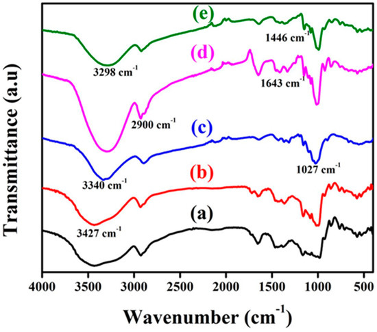FT-IR spectra of individual starches, GNF, and bionanocomposites of PS–GNF (5% GNF) and TS–GNF (5% GNF) are shown in Figure 1. PS and TS showed almost a similar pattern and a very broad band appeared at 3427 cm−1, due to the vibration of the H-bonded hydroxyl groups (O-H) [29]. The typical broad band at 3340 cm−1, due to the -OH group stretching of the cellulose and it was decreased to 3298 cm−1, in both GNF–PS and GNF–TS. This was due to the intermolecular hydrogen bonding between GNF and the starch matrices, which indicated the formation of bionancomposites [30,31]. The peak at 2900 cm−1 matched up with the C-H symmetrical stretching which indicated the existence of polysaccharide functionality, and was observed in all of the samples. The sharp peak at 1027 cm−1 represented the C-O-C and C-H vibrational stretching of cellulose. It indicated that the hemicellulose xylan, presented in the GNF, confirmed the higher cellulose content in the GNF [11]. The peak presented at 1446 cm−1 was attributed to the H-C-H in plane-bending vibrations. Moreover, the H-O-H bending of the absorbed water was detected at 1643 cm−1 which was larger in the GNF–PS than the GNF and GNF–TS, indicating that the GNF–PS was more hygroscopic than GNF and GNF–TS [32]. This was further confirmed by the larger -OH stretching of the GNF–PS, at 3298 cm−1, compared to the GNF–TS.