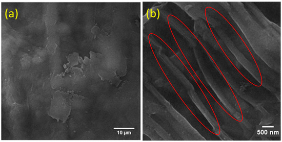 The scanning electron micrographs of the GNF and the bionanocomposites of the PS–GNF and TS–GNF are shown in Figure 2 and Figure 3. Figure 2a,b shows the morphological changes before and after the homogenization. The cellulose matrix was in a colloidal stage before homogenization was attributed to the hydrolysis of the matrix and after the homogenization, the width of the GNF decreased to 130 to 200 nm, as in the Figure 2b, which indicated that high pressure could reform the structural morphology of the cellulose.