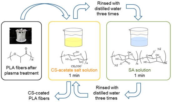 The PLA fiber was coiled on a frame and washed twice with 1% Tween 20 solution. The washed PLA was rinsed three times with distilled water and dried at room temperature. A 1% CS solution was prepared as follows. A 2 g sample of CS was dissolved in 1% aqueous acetic acid and freeze-dried to remove excess acetic acid and water. The obtained CS-acetate salt was then dissolved in 200 mL of water. The PLA fiber was protected against acetic-acid damage through the preparation of the 1% CS solution used in this method. A 1% SA solution was prepared by the overnight stirring of 2 g of SA in 200 mL of water. The coating method involving plasma treatment and the LBL method is described below.