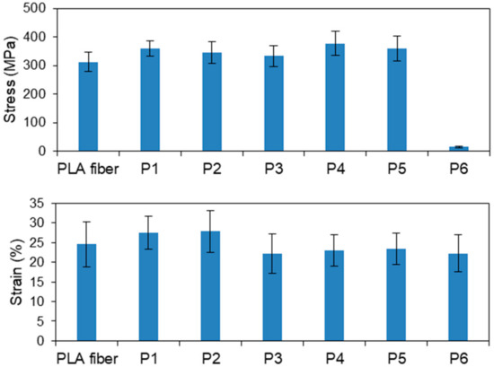 Figure 2 displays the tensile stresses and strains of the various plasma-treated PLA fibers. The average tensile stresses of samples P1–P6 were 359, 345, 334, 378, 359 and 15.7 MPa, respectively. Other than P6, the tensile stresses of the samples were slightly higher than that (312 MPa) of the original PLA fiber; however, the differences were not significant. Fibers treated for longer times exhibited decreased tensile strengths. In particular, the tensile strength of P6 was extremely low, with a stress of about 15.7 MPa, which is ascribable to the observation that P6 melted when exposed to the heat produced during high-power plasma treatment for long times; clearly, PLA is damaged by long plasma treatments. The average strain of each sample was almost identical to that of the original (untreated) fiber. However, P3–P6 showed lower values than P1 and P2, because PLA fibers got damaged under treatment with a high power of 200 W or a long time of 30 min. These results reveal that the strengths and strains of the PLA fibers are not affected by plasma treatment under the appropriate conditions, namely, treatment at low power for short times.