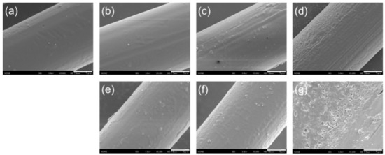 SEM images of plasma-treated PLA fibers: (a) untreated PLA fiber; (b) P1; (c) P2; (d) P3; (e) P4; (f) P5; and (g) P6 (magnification: 5000×, scale bar: 5 µm).