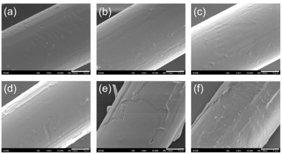 SEM images of CS-coated PLA fibers: (a) untreated PLA fiber; (b) C1; (c) C2; (d) C3; (e) C4; and (f) C5 (magnification: 5000×, scale bar: 5 µm).