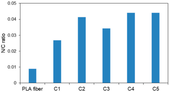 The nitrogen-to-carbon (N/C) ratios of the CS-coated PLA fibers were determined by XPS, the results of which are displayed in Figure 6. The amount of CS coating on the PLA surface was determined by measuring the nitrogen and carbon contents, as amide groups are present only in the structure of CS and not in the PLA. The nitrogen content of the original PLA fiber was also determined because a plasticizer is usually added during the preparation of PLA. However, the plasticizer content does not influence other data because the PLA surface was determined to have an N/C ratio of only 0.005 and is covered by the CS layer. The C1 sample exhibited a higher N/C ratio compared to that of the original PLA fiber. While the N/C ratios were higher in C2–C5 than C1, these samples all exhibited similar N/C ratios. This observation reveals that the LBL method produces homogeneous CS coatings, since XPS examines the top surface and the C2 sample already contains a homogeneous CS layer. These results suggest that plasma treatment and the LBL method effectively coat the PLA fibers with CS.