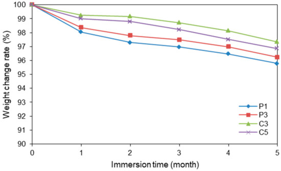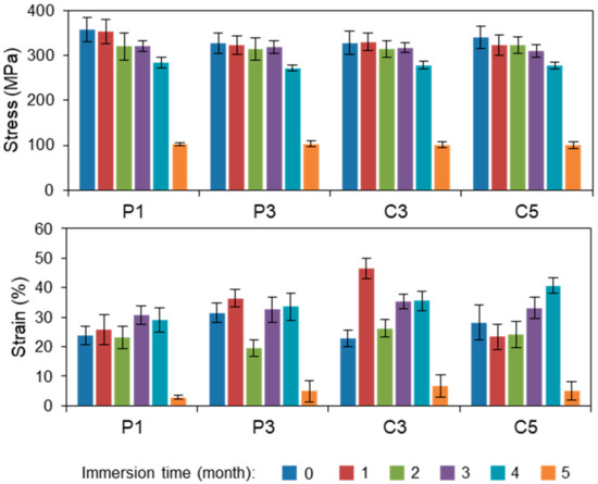 Figure 8, Figure 9 and Figure 10 display the rates of weight change, SEM images, and tensile strengths, respectively, of P1, P3, C3, and C5. Figure 8 and Figure 9 reveal that all degraded samples exhibited at least 95% of their original weights and retained their shapes after five months of immersion in PBS solution. The observed decreases in weight indicate that the PLA samples become hydrolyzed in PBS over time. No samples could be retrieved from the PBS solution when immersed for longer than six months because the PLA fibers had collapsed by hydrolysis. The CS-coated fibers appeared to be slightly more stable than the uncoated plasma-treated fibers, because the polyelectrolyte layers of CS and SA had low solubility. However, the difference in stability was not significant; thus, it was concluded that the degradability of the fiber coated with CS and SA was maintained.