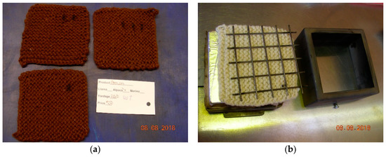 The Jacob and CVM/Romeldale fibers were worsted weight yarns purchased from Roving Acres Farm (Pierpont, OH, USA). The Alpaca, Alpaca/Merino, and Llama/Merino blends were sport weight yarns purchased from Checkered Flag Fibers (Springfield, OH, USA). The yarns are of different density, which is a function of their commercial availability as yarns for hand-kitting are often made available in a wide range of densities, and are not produced to one specific standard.